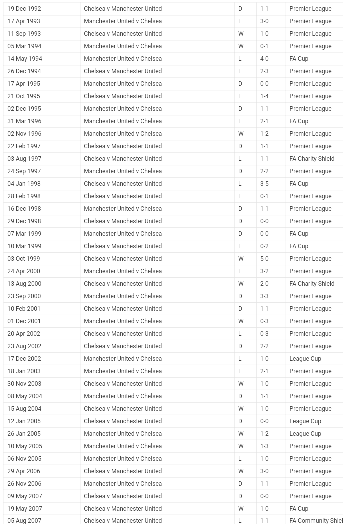 Chelsea Vs Man United Head To Head , Last 50 Man Utd Vs Chelsea Matches.